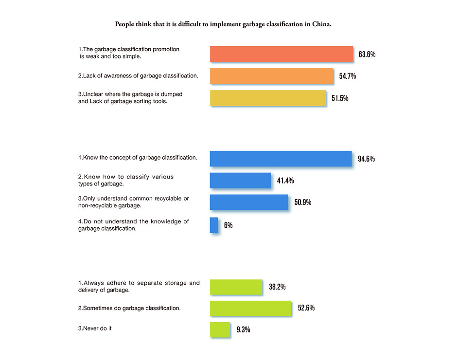 1. In the process of garbage sorting, people are not clear about the types of garbage, and they think garbage sorting is troublesome in the absence of volunteers, especially the elderly.